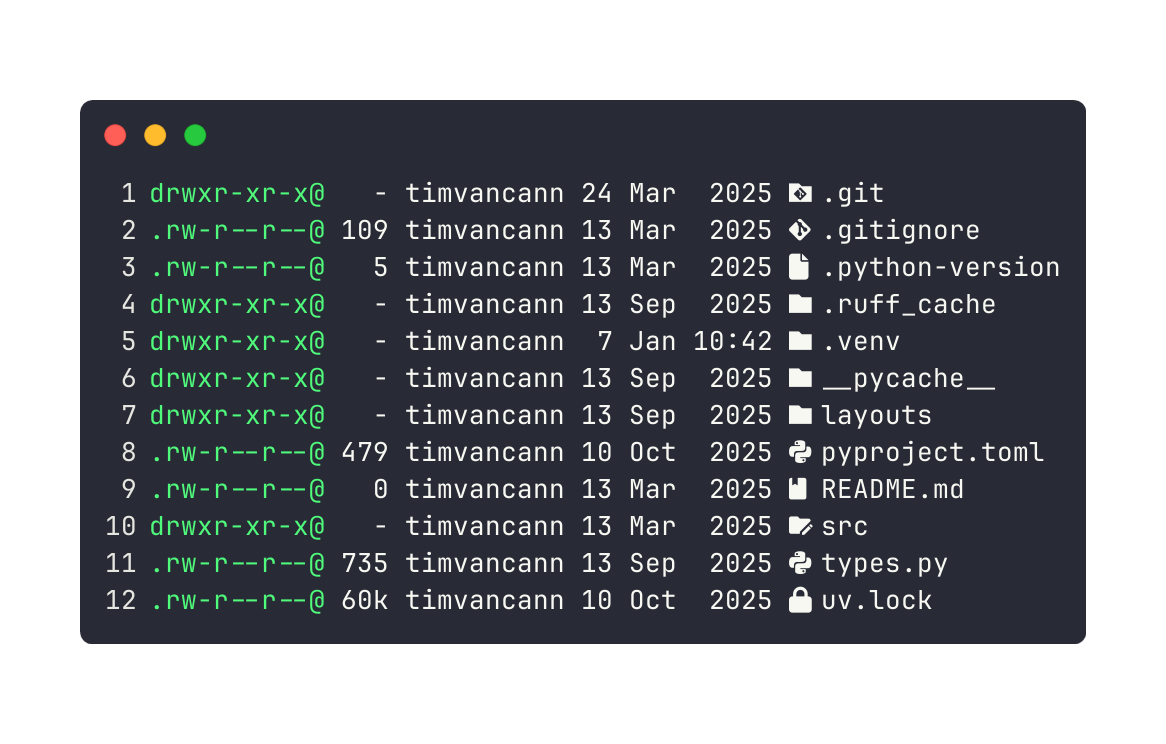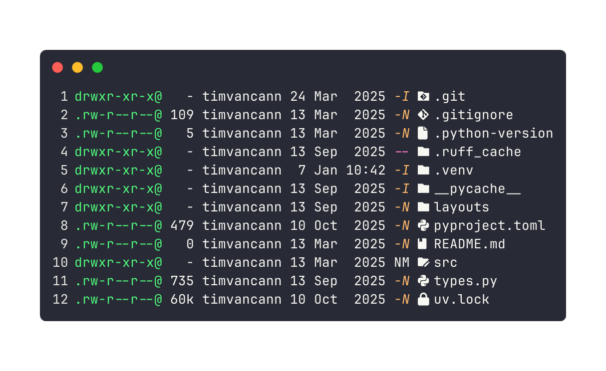 Git integration: See which files are modified, new, or unchanged right in the listing. No need to run git status separately.